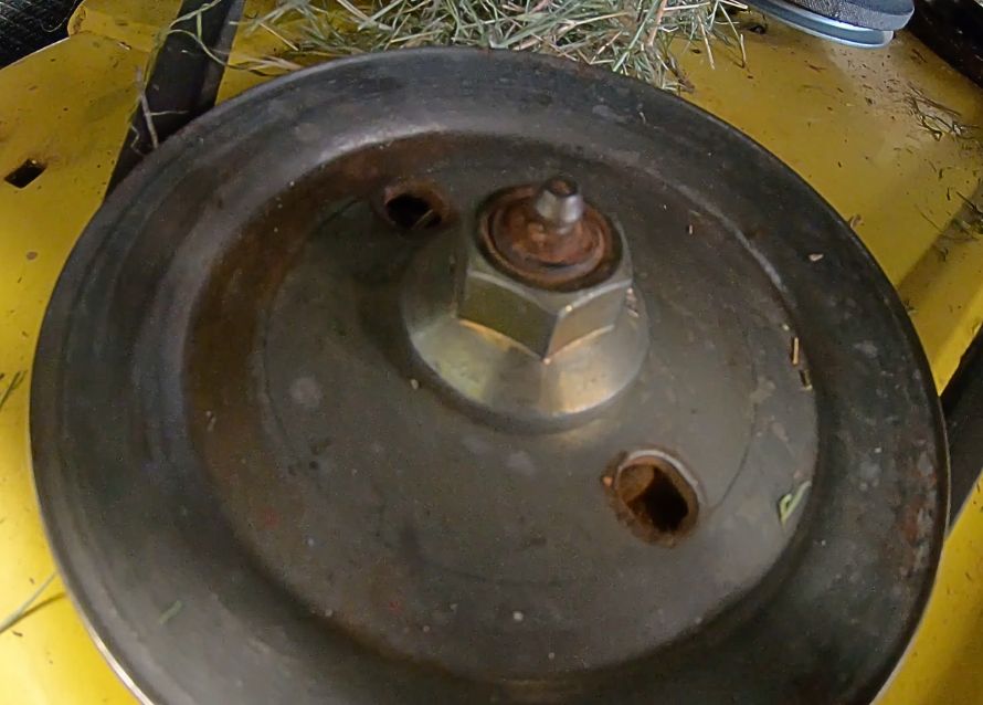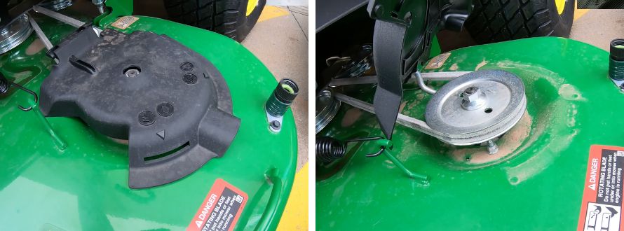 The mower deck, with grease zerks on all spindles (the parts that turn the blades), needs regular greasing to avoid internal damage and ensure smooth operation of the bearings.