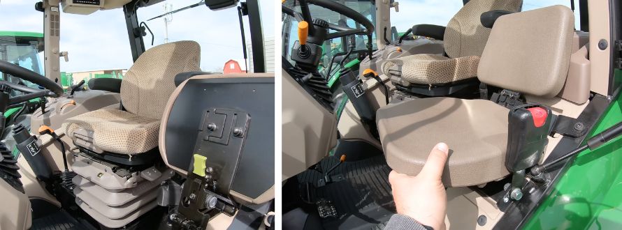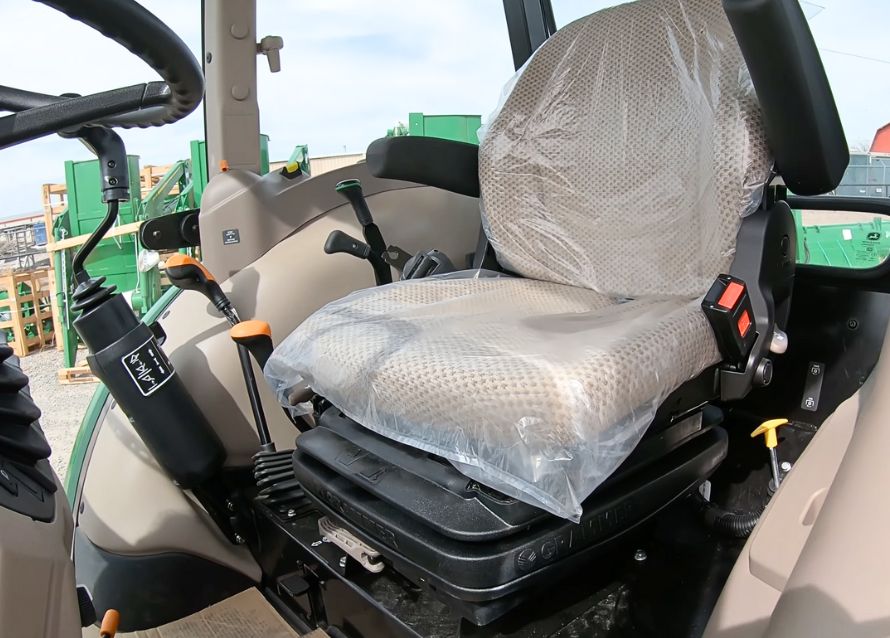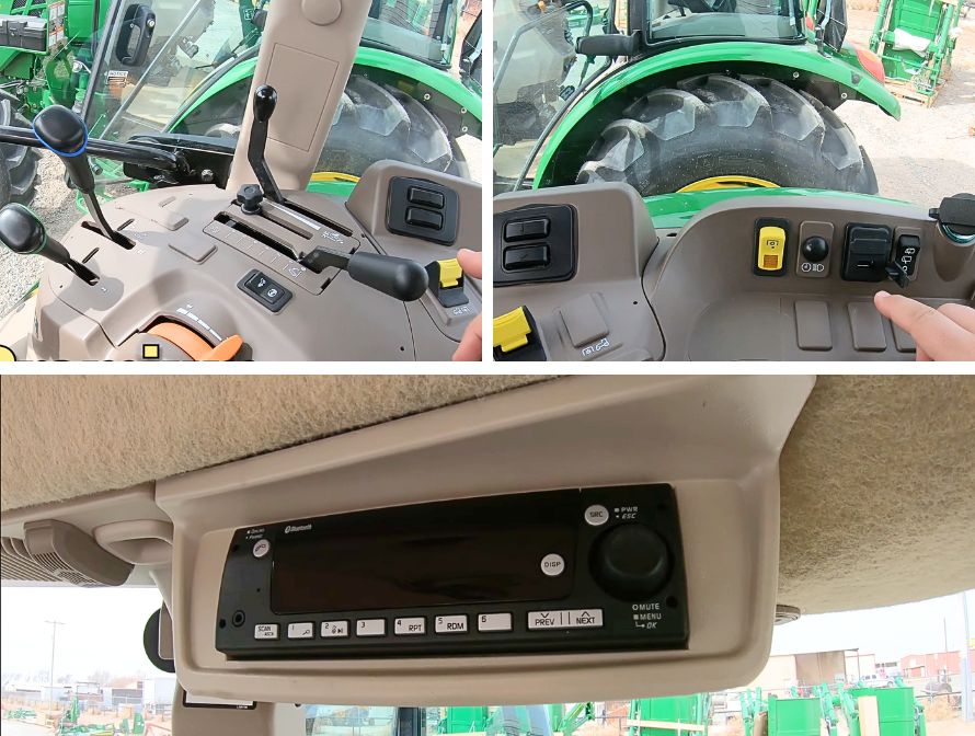 The control panel in the standard cab features shifters and rear hydraulic remotes, along with a three-point adjustment, all located to the side of the seat. The standard cab does not come with a Bluetooth radio.