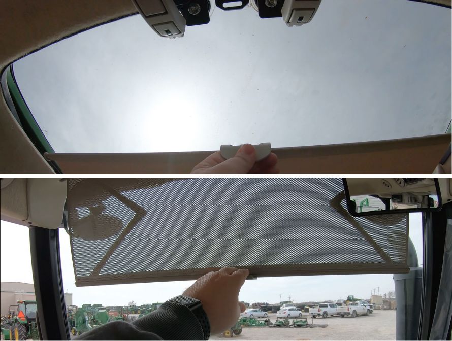 The premium cab's visibility features have been enhanced with an overhead window for a panoramic view, ideal for loader work. Additionally, the cab includes roll-out shades for both the overhead and front windows to protect against sun glare.